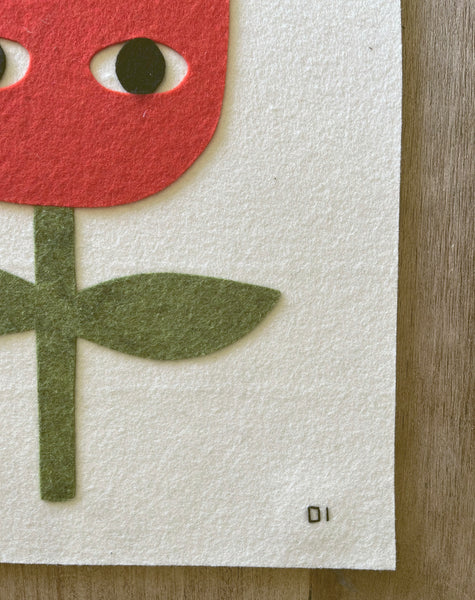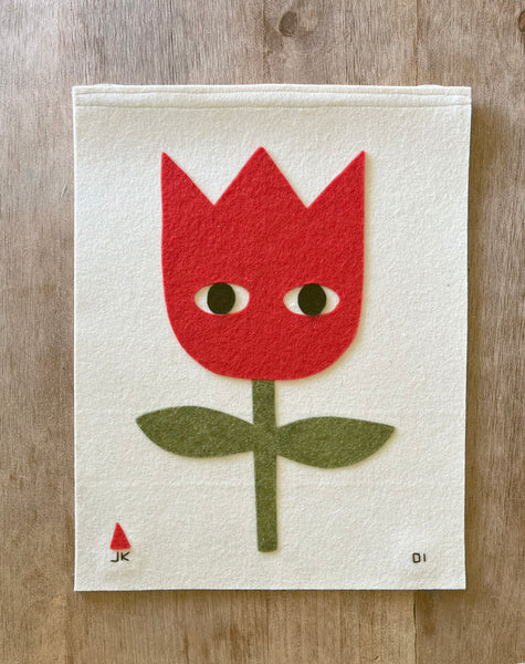 Unlimited numbered editions.  Heavy pure wool felt base.  Artwork is hand-cut wool felt with hand-sewn details.  Sewn in dowel and string loops on each end for hanging. This is a made-to-order item.  16 1/2" X 13"